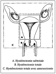 L'hystérectomie consiste en l'ablation chirurgicale de l'utérus. Elle peut comporter l'ablation du col de l'utérus : il s'agit alors d'une hystérectomie totale. Lorsque le col de l’utérus est conservé on parle alors d’une hystérectomie subtotale. Selon les cas, il peut être nécessaire de réaliser l'ablation des ovaires et des trompes, l'intervention est dénommée dans ce cas hystérectomie avec annexectomie. Si on conserve les ovaires et les trompes on parle alors d’une hystérectomie inter-annexielle. |